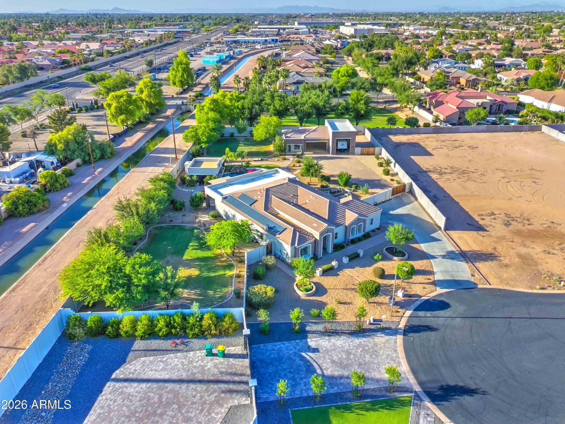 Custom estate on over an acre cul-de-sac lot located on a county island, offering enhanced privacy and room for entertaining. Featuring a split floorplan, 4-bedroom, 2.5-bath main home with attached 4-car tandem garage and detached combined RV garage, double bay garage, and 1-bedroom casita. Resort-style backyard designed for indoor-outdoor living. Saltwater pool with swim-up bar. Outdoor shower. Sunken ramada featuring gas fireplace, above-ground spa, and integrated pool bar. Electric pool heater/chiller for year-round use. Horseshoe pits. Putting green. Natural gas plumbed stone firepit. BBQ area with built-in grill, side burners & sink under a louvered pergola with roll-down shades. Misting system spans patio, pergola, & pool bar for extended outdoor comfort. Energy-efficient construction includes an owned solar system, Low-E dual pane windows, & Trane HVAC units. Located within the highly regarded Chandler Unified School District and conveniently close to shopping, dining, and entertainment, while maintaining a private, suburban setting.