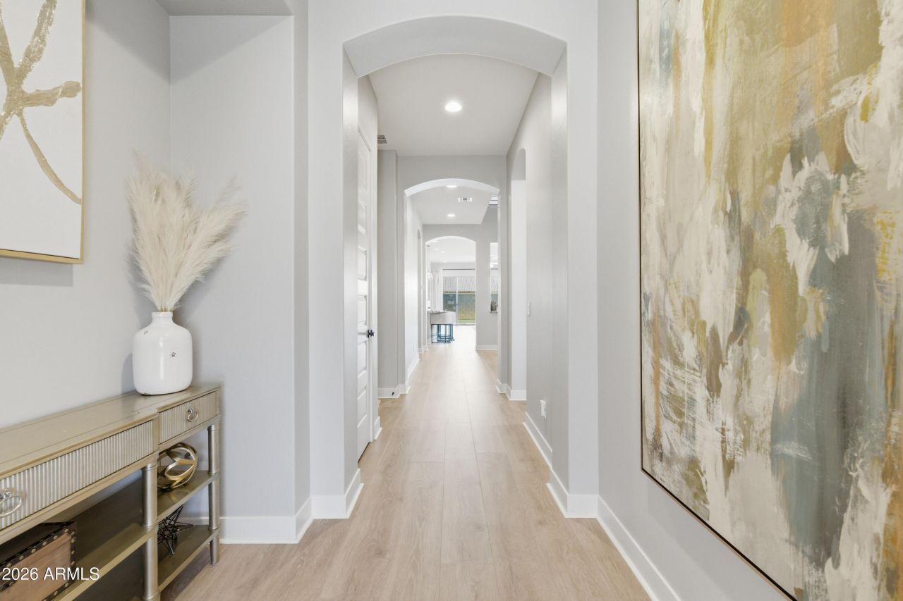 Beautifully upgraded home with $118K+ in premium upgrades & a desirable gourmet kitchen layout. The chefs kitchen features upgraded stacked cabinetry, granite countertops, sleek cooktop, convection oven w/Advantium, decorative tile backsplash, & designer pendant lighting. The open great room is highlighted by a 74 contemporary fireplace and a 16 glass atrium door that creates seamless indoor-outdoor living to a backyard with pergola & artificial turf. The primary suite offers a spa-inspired tiled shower, while additional upgrades include luxurious wood flooring. Spacious loft offers additional living space. Located in the sought-after Barney Farms community with lakes, pools, pickleball, trails, & more--just steps from Queen Creek Frontier Family Park, Rec Center, and Aquatic Center. Barney Farms is a premier new build community with views of the San Tan Mountains & Superstitions. Across from the new Queen Creek Frontier Park and QC Recreation & Aquatic Center. This resort-style community includes deep water lakes for catch & release fishing & kayaking, an aquatic center with splashpad, leisure/lap, sports pools. A clubhouse for socials, events, and rental venues. Amenities include pickleball, basketball, sand volleyball, corn hole, bocce ball, themed playgrounds, miles of walking paths, covered ramadas with BBQs, & more!MISCELLANEOUSWood flooring16 Glass atrium door at great room74 Allusion electric fireplaceUpgraded Prague Kwikset handlesetsModerna vanity sinksGranite top at dining Mirror closet doorLarger interior door at garageHoliday receptacle outletsInterior garage 120V outletEV outlet for level II charging stationJack shaft opener at garage 1Security camera prewireWireless access point prewireHigh efficiency heating & cooling systemIndoor airPLUS certifiedHoneywell home - WiFi thermostatSound control insulation at 2nd floorModerna 5 baseboards & 2-1/4 door casingsRinnai v94i tankless water heaterAqua-Pex plumbingHot/Cold soft water loopExterior BBQ gas stubModern stair rail post & stainless spindlesStorage racks and shelving at garageEpoxy garage flooring$70k+ Exterior landscape & Entertainment Pergola