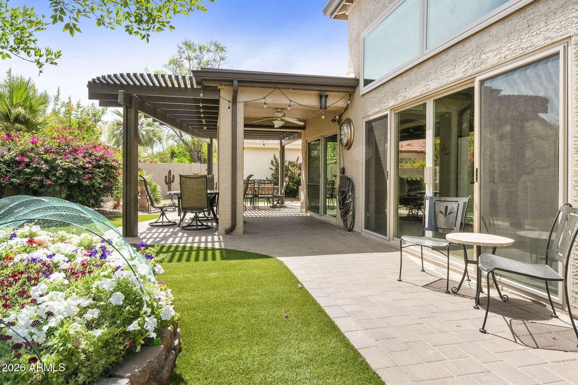 Beautiful Pima Villa in the sought-after active adult community of Sun Lakes, offering exceptional outdoor living! This thoughtfully designed home features a spacious family room with vaulted ceilings, plus versatile spaces including a dining room or office and a cozy den. The lush backyard is an entertainers dream with a wraparound patio, pergola, flower boxes, putting green, fountain, covered patio, and charming beehive fireplace. Inside, enjoy two ensuite bedrooms plus a convenient half bath for guests. Upgrades include newer windows, doors, HVAC, remodeled kitchen and baths, RO system, water softener, plantation shutters, electric shades, vinyl flooring, and water heater. Experience resort-style living with golf, tennis, pickleball, pools, fitness center, dining, clubs, and more!
