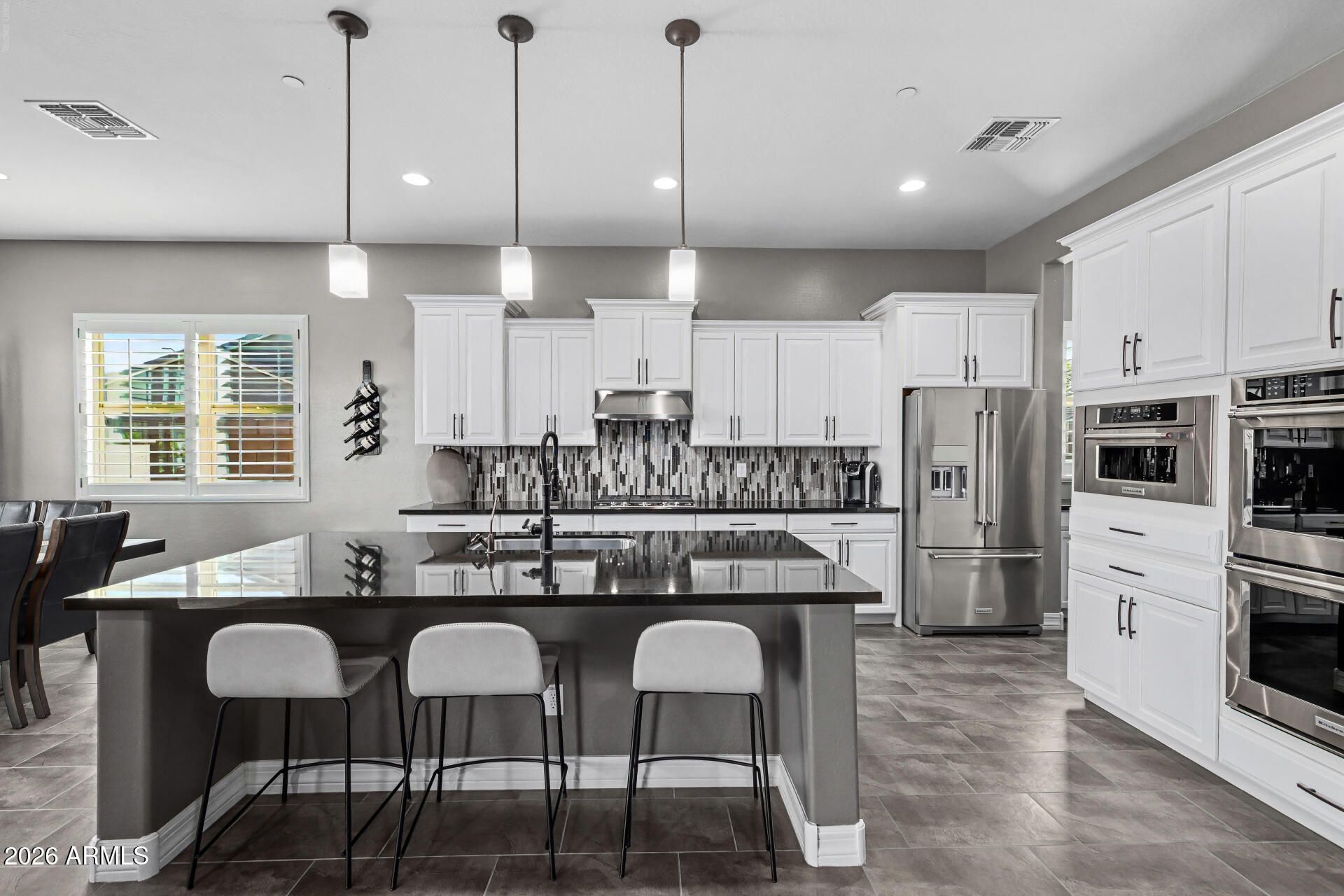 This home exudes pride of ownership! This one of a kind home has it all. Stunning interior w/ tile flooring, 4 plantation shutters, recessed lighting, surround sound. The living room flows into the family room w/ a cozy fireplace & built-in media niche. The kitchen features SS appliances, granite counters, a center island w/breakfast bar, tile backsplash, staggered cabinetry w/crown moulding, a butlers service area, & a walk-in pantry. The luxurious main suite w/ a lavish bathroom offering a dual sink vanity w/makeup area, tiled shower, & walk-in closet. A sparkling pool w/ a custom built pergola, sunken BBQ lounge & a swim up pool bar. PAID off solar panels, BEST PART- 5 car garage w/ a 900 sq ft addition that could be used for a man cave, gym, mutli gen casita, endless possibilities! Additional highlights include a functional mudroom & a well-equipped laundry room w/cabinetry & stacked washer/dryer. The attached casita is perfect for guests or multi-generational living, including its own open living space, kitchenette, walk-in closet/pantry, & full bathroom. Serene backyard has multiple seating areas, a fire pit, a sparkling blue pool, Ramada w/sunken built-in BBQ, & covered patio. This remarkable property is sure to sell fast!