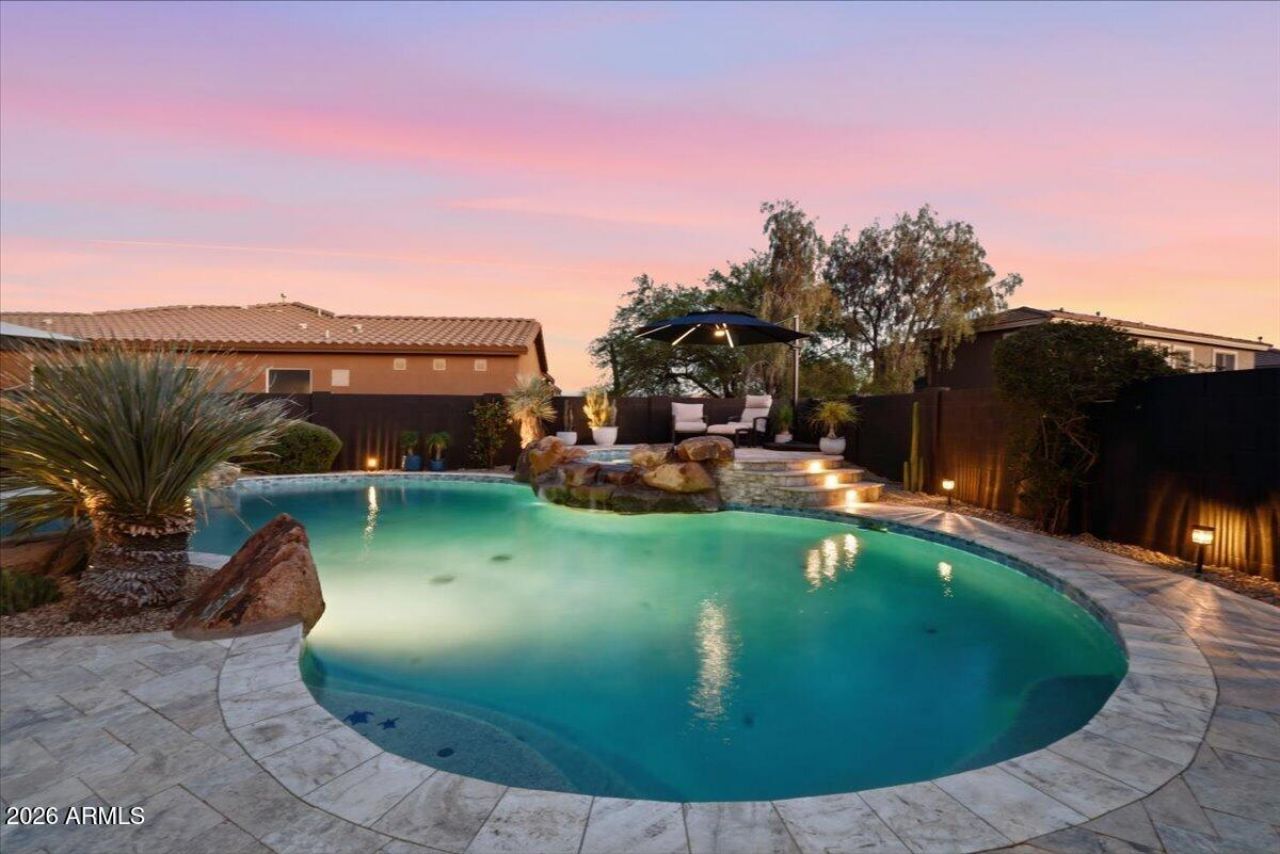 A rare blend of space, style, and privacy; this beautifully updated 5-bedroom, 3.5-bath home is designed for both everyday living and effortless entertaining. Thoughtfully laid out with a main-floor generously sized bedroom and full bathroom, this home offers ideal flexibility for multigenerational living, guests, or a private home office.From the moment you step inside, youre welcomed by a bright, open atmosphere and thoughtfully reimagined spaces that feel both modern and inviting. Updated luxury vinyl plank flooring flows seamlessly throughout, while expansive new Anlin windows fill the home with natural light and enhance comfort. These windows provide excellent sound reduction and improved temperature insulation for a quieter, more energy-efficient living environment that feels calm and effortlessly livable. The home offers two inviting living areas, one just off the front entry and another off the kitchen, both thoughtfully designed to support comfortable, everyday living while offering flexibility for how you choose to use the space.The updated kitchen with Kitchen Aid Appliances is both stylish and functional, featuring abundant storage, generous counter space, and a layout that opens directly to the backyard thus creating the perfect indoor/outdoor flow for entertaining and everyday living.Upstairs, the spacious primary suite offers a true retreat, complete with a private ensuite bath and walk-in closet. Three additional oversized bedrooms provide plenty of room to grow, work, or unwind, all thoughtfully positioned near a full bathroom that offers both convenience and functionality for family and guests alike.Step outside to your own private retreat. The oversized lot offers exceptional privacy with no neighbors behind you and features a large pool and spa which was recently remodeled with Caribbean Blue finish, new silver travertine decking, and a pergola with shaded seating. A spacious grass area in the backyard adds even more versatility; ideal for play, pets, or simply enjoying the outdoors. The beautifully landscaped setting makes this backyard truly special.Every detail has been thoughtfully curated to create a sense of simplicity, warmth, and comfort throughout. A rare and unique find in Anthem, this home combines space, privacy, and thoughtful updates in a way thats hard to come by.
